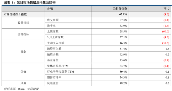 第一轮市场情绪总指数最高达到95.5%分位的历史峰值。