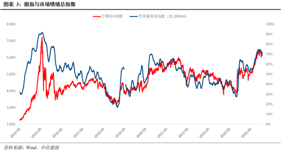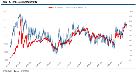 在2024年9月开启的本轮牛市中,万得全A指数2025年10月29日阶段性见顶,市场情绪总指数9月25日阶段性提前见顶。