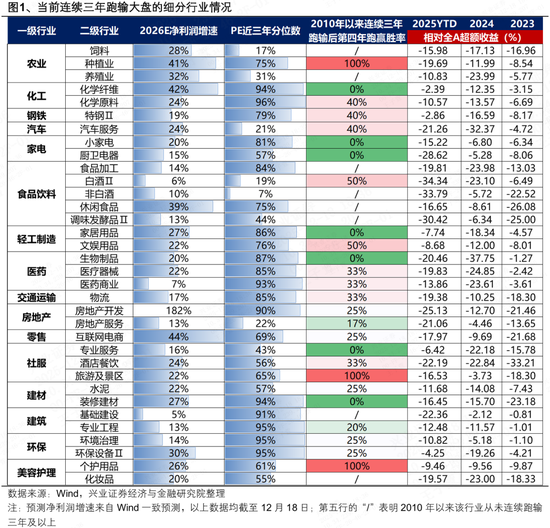历史经验看,2010年以来未出现过连续三年跑输/连续三年跑输后第四年跑赢胜率较高的细分行业包括:食品饮料(休闲食品、食品加工、调味发酵品、非白酒)、农业(养殖业、饲料、种植业)、美容护理(化妆品、个护用品)、基础建设、旅游景区。