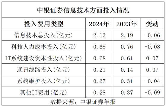 中银证券2024年年报显示,公司信息技术投入占营业收入比例超过6%,整体投入规模并不低。其中,科技人力成本6841.92万元,IT系统建设资本性投入6757.15万元,通讯线路费用2095.94万元,系统维护投入2743.84万元,其他IT费用2814.78万元。