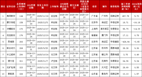 统计显示,今年上市用时最短的是南网数字,用时144天,摩尔线程 158天、沐曦股份170天,今年IPO用时最短的10家企业,均为今年9月以后上市企业。