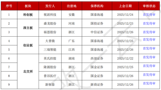 岁末,IPO上会审核一浪高过一浪,下周审核的企业总数达到9家。