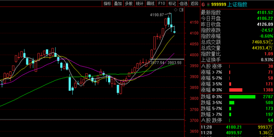 我认为这种调整很有必要,因为即便跌到4101点,仍高于20日线和五周均线4008点93点,大盘乖离率大幅下降,市场仍处于多头市场形态。