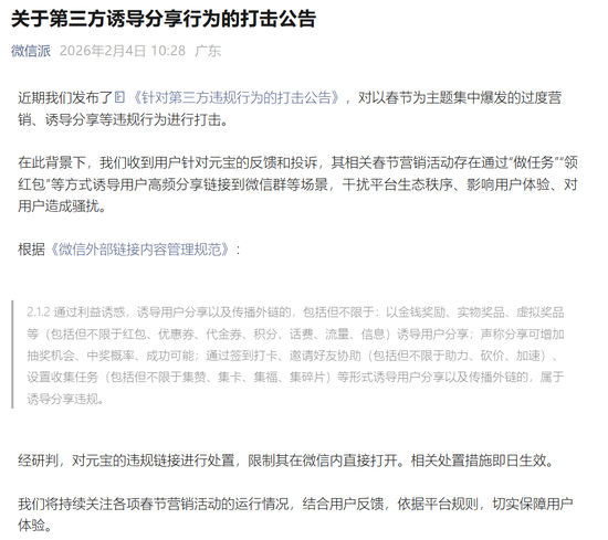 经研判,对元宝的违规链接进行处置,限制其在微信内直接打开。相关处置措施即日生效。我们将持续关注各项春节营销活动的运行情况,结合用户反馈,依据平台规则,切实保障用户体验。