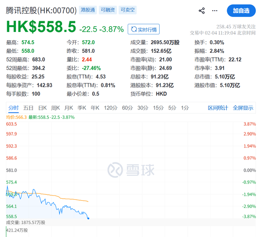 消息出来之后,腾讯股价下跌3%。