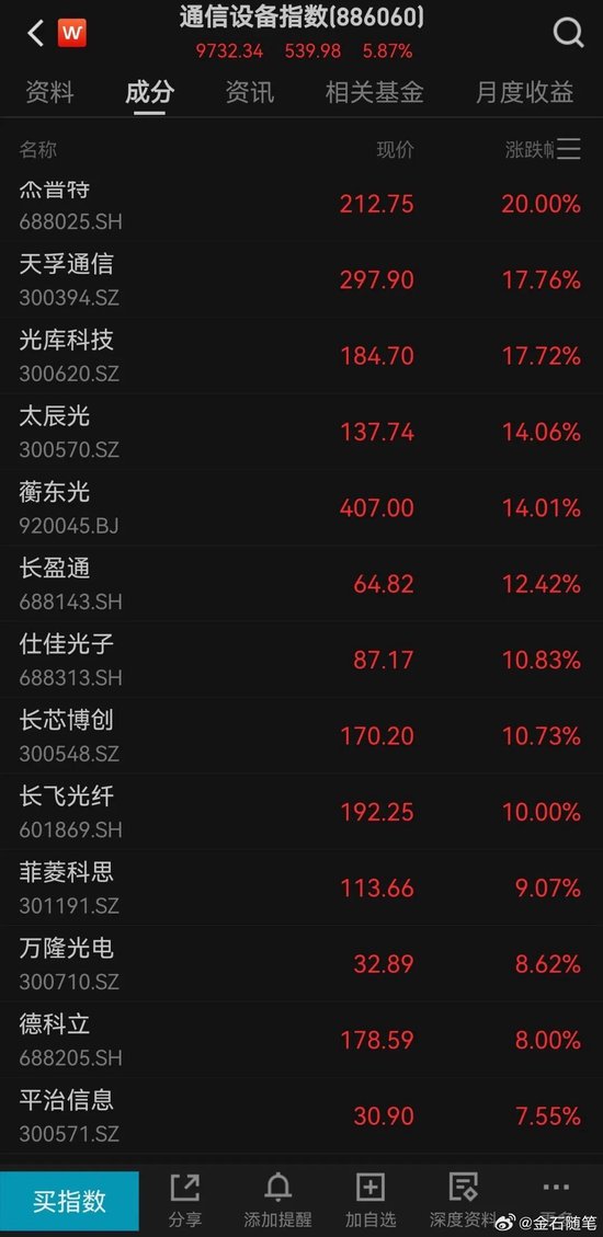 全行业全部走强,通信设备、互联网、文化传媒、半导体等集体暴涨,涨停潮频现。