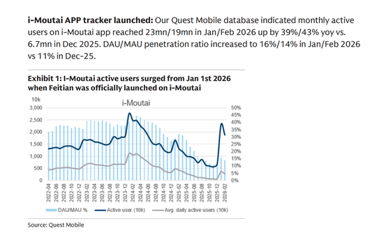 高盛引用了Quest Mobile数据进一步佐证了i茅台的影响力,2026年1-2月其月活跃用户数分别达2300万、1900万,较2025年12月分别增长39%、43%,用户粘性显著增强。