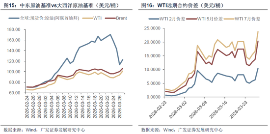 原油方面,此前Brent和WTI作为大西洋基准,因运输时滞和库存影响,并未真实反应霍尔木兹海峡的封禁对油价的影响。真正能反映实物短缺的,是中东原油基准——Dubai/Oman原油现货价。该油价最高达到170美元/桶以上,随着近期特朗普的TACO,中东油价有一定回落,但仍然与大西洋基准存在缺口。只要霍尔木兹海峡不解封,油价预计仍然会保持上行趋势,WTI原油整体中枢预计在100-105美元。