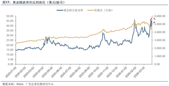 黄金方面,在市场恐慌的环境下,投资者往往先抛售流动性高的资产(如黄金、美债),因此在冲突爆发后,金价大幅下跌。但是由于特朗普TACO,本周金价有一定程度的反弹。然而黄金的隐含波动率再次到达高位。究其原因在于,即便流动性风险削弱,但由于地缘政治局势反复,短期不确定性仍然较大。