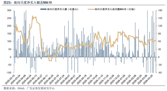 南向资金本周保持净流入。本周(3月23日—3月27日)南向资金净流入额141.46亿港元,上周为净流入135.66亿港元。个股层面,南向资金净买入额排名靠前的个股包括盈富基金(净买入106.67亿港元),泡泡玛特(净买入36.84亿港元),恒生中国企业(净买入34.31亿港元);净卖出额排名靠前的个股包括中芯国际(净卖出31.66港元),中国移动(净卖出6.72亿港元),信达生物(净卖出1.92亿港元)。