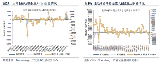 本周日本市场资金净流入减少、发达欧洲市场资金转净流出。其中,日本市场本周净流入3.74亿美元,较上周净流入15.43亿美元减少;发达欧洲市场本周净流出31.39亿美元,上周净流入0.40亿美元。