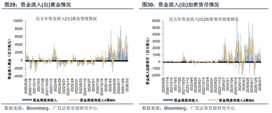 本周黄金市场资金净流入增加、加密货币市场资金净流入减少。截至本周三(3月18日—3月25日),黄金市场周度资金净流入63.46亿美元,相比上周流入45.19亿美元增加。加密货币资产周度资金净流入5.27亿美元,相比上周净流入12.98亿美元减少。