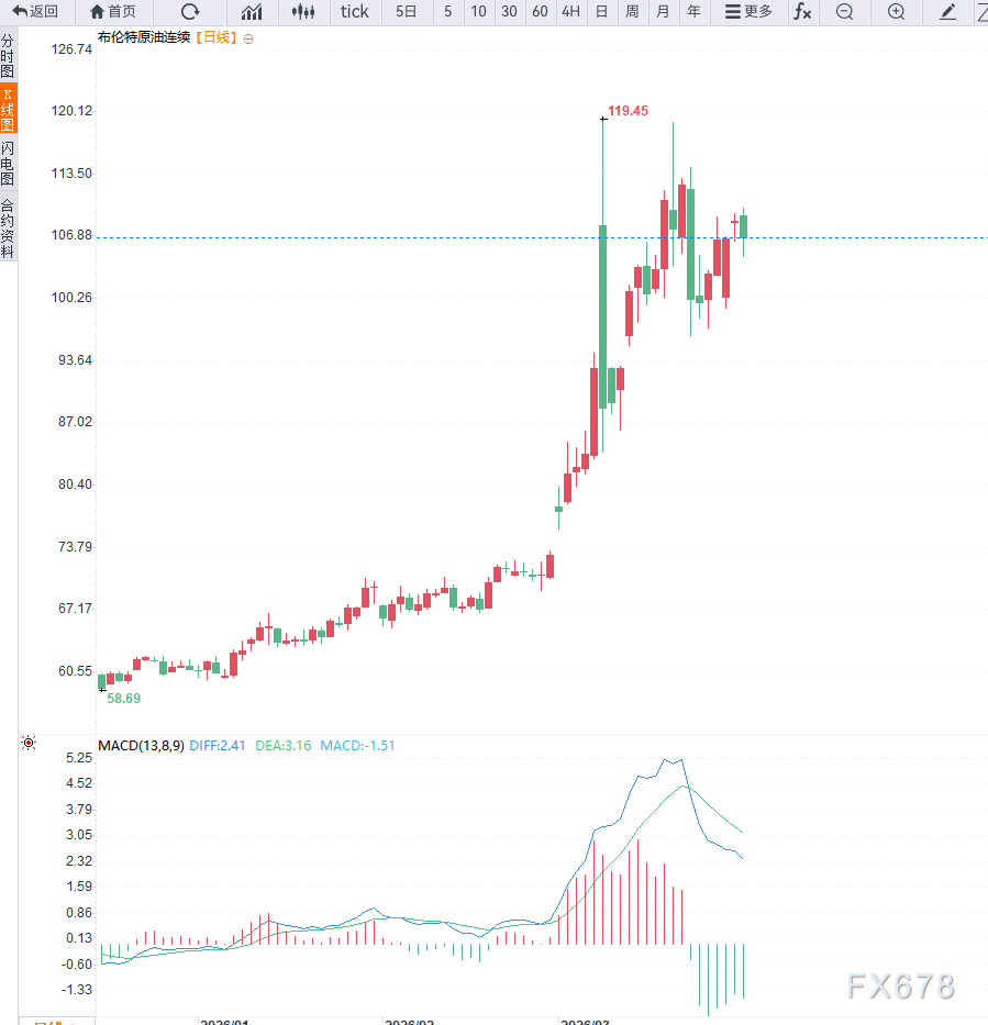 从技术面来看,日线级别上,布伦特原油整体处于强势上行趋势中,但在快速拉升后动能开始分化,价格波动加剧。上方关注112美元及125美元关键压力区间,下方支撑位位于100美元及95美元区域。4小时级别来看,价格呈现高位震荡结构,短期动能指标出现超买回落迹象,显示市场存在技术性修正需求。若回落至关键支撑区域并企稳,仍可能再度上行。