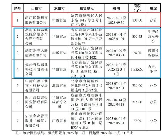 从华盛雷达披露的租赁信息来看,其在注册地浙江绍兴仅设有一处100平方米的办公场所;相比之下,公司在湖南长沙则集中布局了生产经营、设备存放及办公等多项职能,相关场地面积合计近2800平方米。此外,公司在北京、成都还分别租有735平方米及215平方米的办公场地。