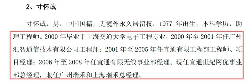 尽管招股书显示,其在2014年6月至2019年8月期间仅于华盛有限任职,但宜通世纪2015年12月7日发布的公告(公告编码2015-106)中明确写道:寸怀诚“2001年9月至今一直在公司任职,现任湖南宜通总经理”。这间接证实了其作为宜通世纪体系内高管的身份。