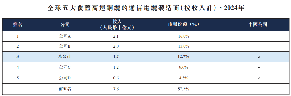 作为公司核心看点,沃尔核材在AI高速通信铜缆领域卡位全球顶级供应链,其224G高速通信铜缆已直接应用于AI数据中心,成为公司业绩增长的重要驱动力。根据弗若斯特沙利文报告,2024年五大覆盖高速铜缆的通信电缆制造商的全球收入约为人民币76亿元,占合计市场份额的57.2%;其中沃尔核材以17亿元收入位列第三,市场份额12.7%,同时也是2024年全球市场中规模最大的中国高速铜缆通信电缆制造商。