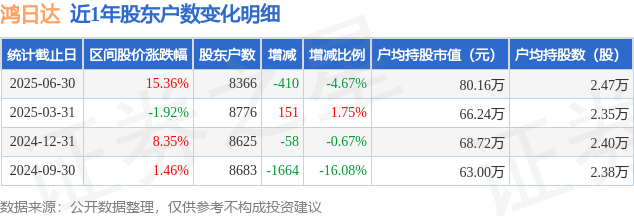 从股价来看,2025年3月31日至2025年6月30日,鸿日达区间涨幅为15.36%,在此期间股东户数减少410.0户,减幅为4.67%。