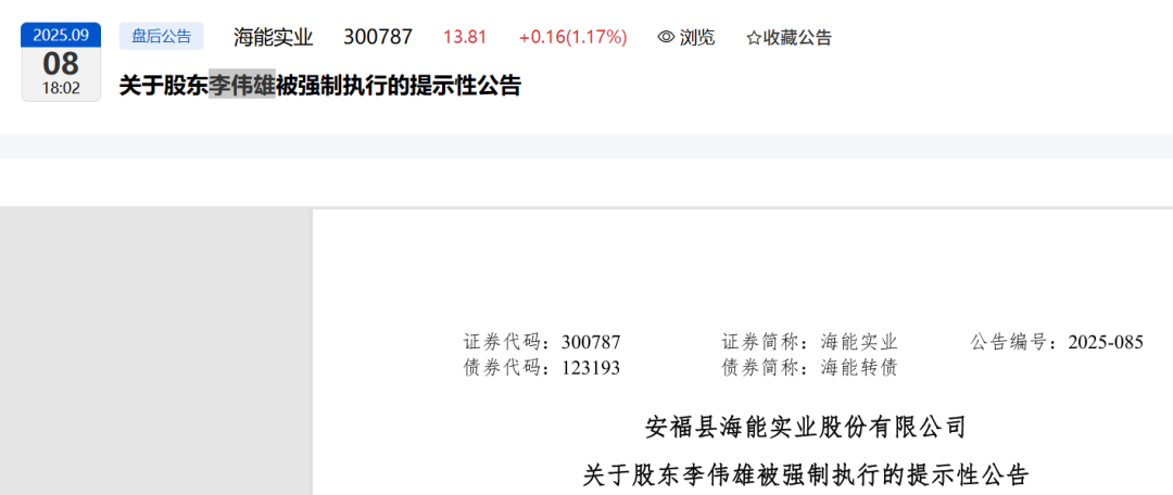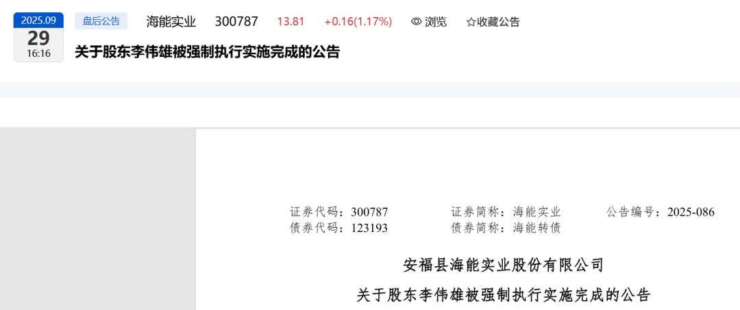 安福县海能实业股份有限公司(以下简称“公司”)202598日发布《关于股东李伟雄被强制执行的提示性公告》(公告编号:2025-085),国家税务总局龙岩市税务局稽查局将对股东李伟雄持有的公司股票10,380,528股依法处置。近日公司收到通知,上述股票已全部处置完毕。