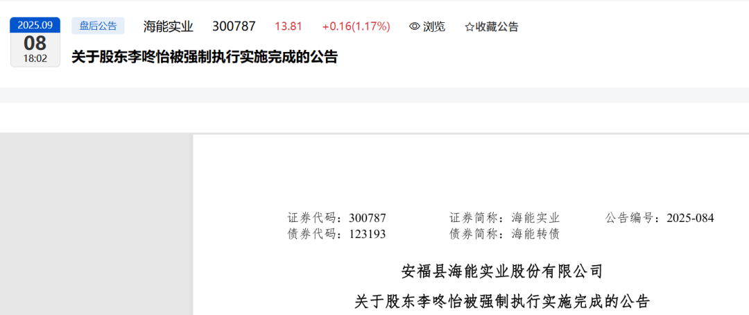 安福县海能实业股份有限公司(以下简称“公司”)2025813日发布《关于股东被强制执行的提示性公告》(公告编号:2025-067),国家税务总局龙岩市税务局稽查局将对股东李咚怡持有的公司股票4,638,826股依法处置。近日公司收到通知,上述股票已全部处置完毕。