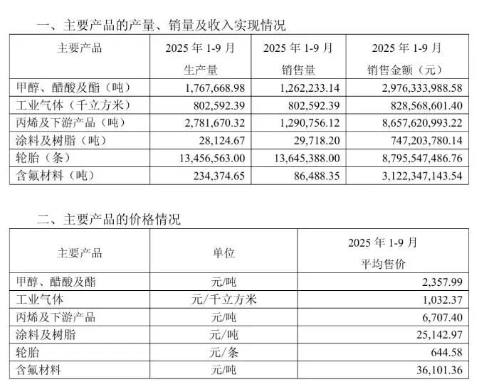 从财报数据看,华谊集团主要化工产品价格在2025年前三季度均出现显著下滑。甲醇、醋酸及酯类均价2357.99元/吨,同比下跌12.9%;工业气体均价1032.37元/千立方米,同比下跌8.4%;丙烯及下游产品均价6707.40元/吨,同比下跌7.8%;轮胎均价644.58元/条,虽同比微增5.2%,但未能抵消化工品跌价影响。