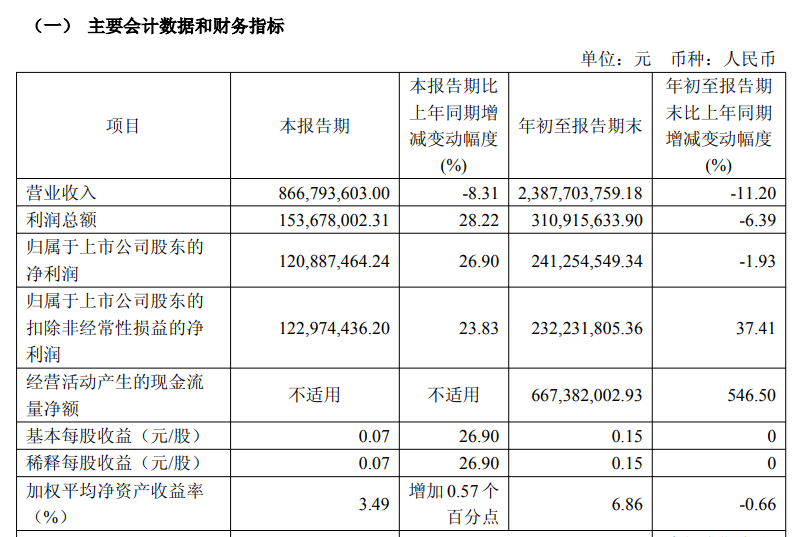 其中第三季度,公司营业收入为8.67亿元,同比下降8.31%;归母净利润为1.21亿元,同比上升26.90%;扣非归母净利润为1.23亿元,同比上升23.83%。