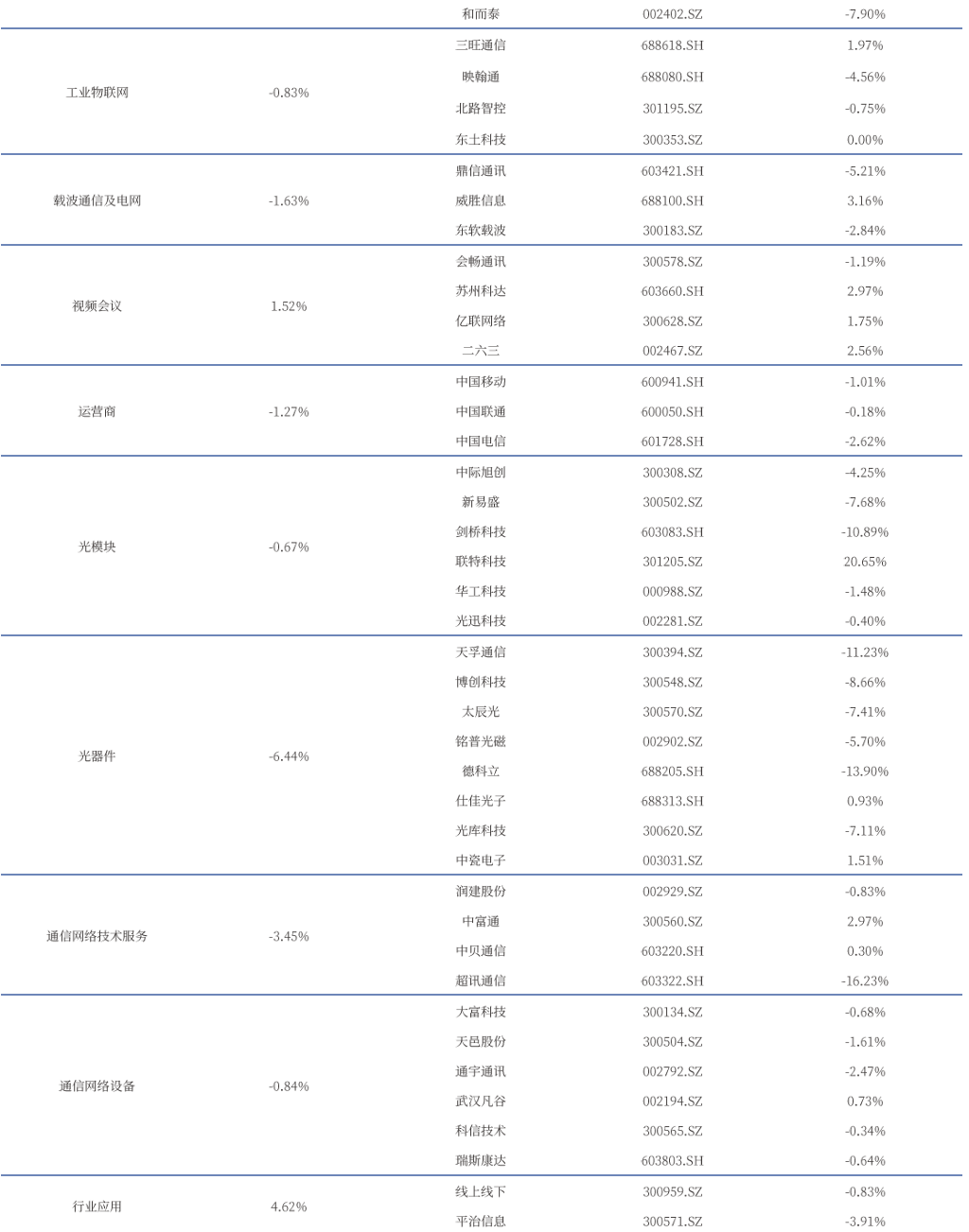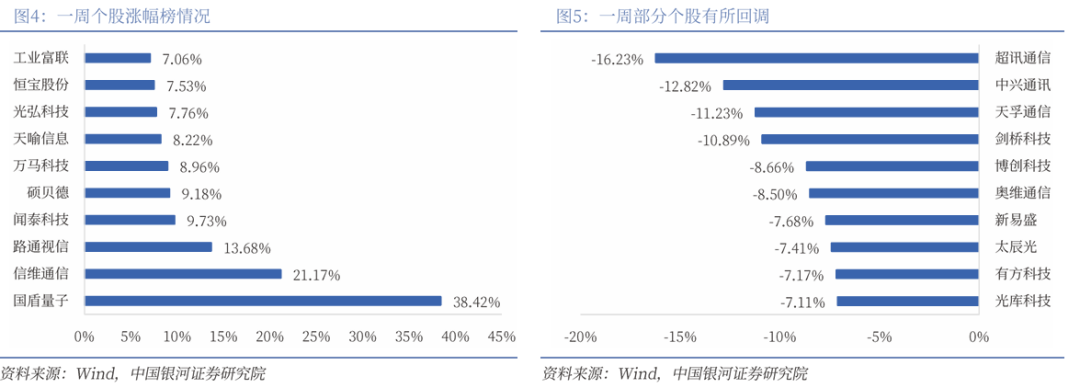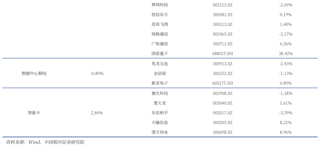 通信板块三级子行业包括通信网络设备及器件、通信线缆及配套、通信终端及配件、其他通信设备、通信工程及服务、通信应用增值服务六大板块。其中,通信终端及配件、通信应用增值服务有所上涨。进一步细分子板块方面,行业应用、智能卡等子板块相关标的表现较好,板块涨幅分别为4.62%、2.84%。