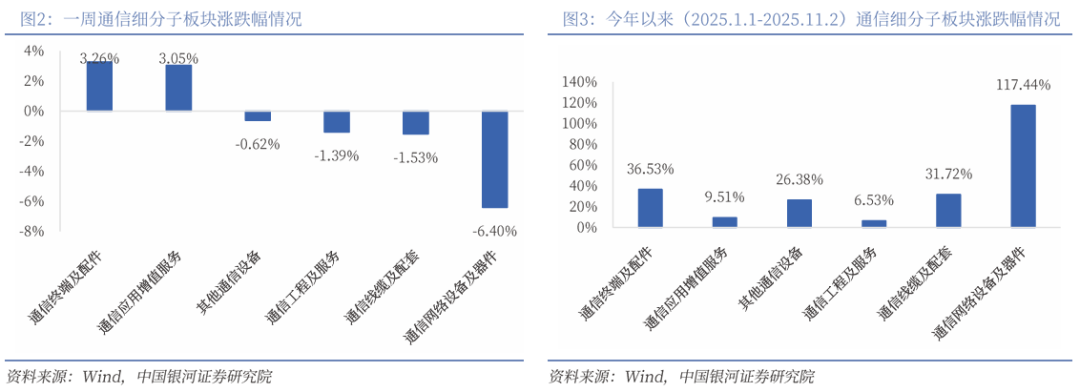 周行情:一周(2025年10月27日-2025年11月2日)上证指数涨幅为0.11%;深证成指涨幅为0.67%;创业板指数涨幅为0.50%;一级行业指数中,通信板块跌幅为3.59%。根据我们对于通信行业公司划分子板块数据,行业应用、智能卡等子板块相关标的表现较好,板块涨幅分别为4.62%、2.84%。