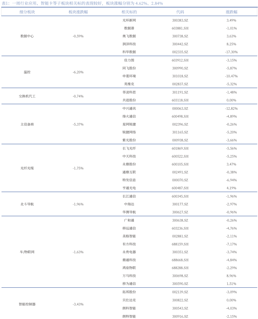 1. 一周通信板块指数下跌,行业应用、智能卡等子板块相关标的表现较好。