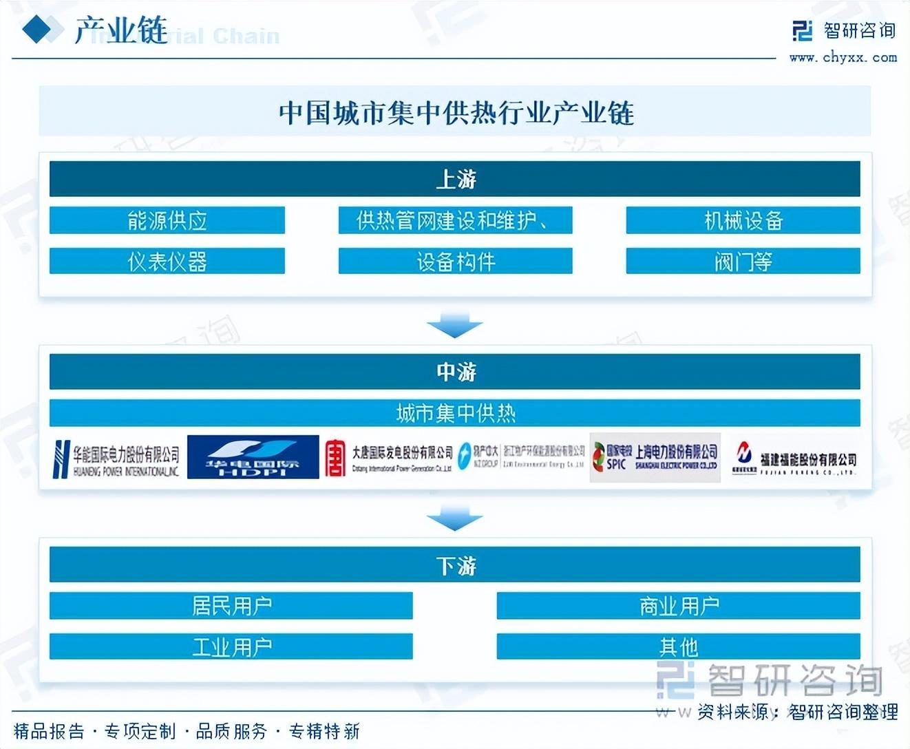 城市集中供热行业上游主要包括能源供应企业、供热管网建设和维护企业、机械设备生产企业以及电子电器、仪表仪器、设备构件、阀门等零部件生产企业,其中,能源供应商为集中供热提供所需的各种能源,包括煤炭、石油、天然气等传统能源以及太阳能、地热能、风能、生物质能等新能源。行业下游为消费用户,包括居民用户、商业用户和工业用户,其中,居民用户是城市集中供热的主要消费群体之一,用于冬季采暖和日常生活热水供应;商业用户包括商场、酒店、写字楼、医院、学校等商业和公共建筑,对供热的需求主要用于采暖、空调、热水供应等;工业用户主要包括食品加工、化工、纺织、造纸等生产过程中需要大量的热能的企业,集中供热为其提供了稳定的能源供应。