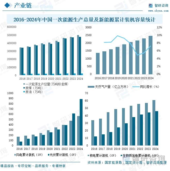 能源供应为城市集中供热行业产业链的起始环节,我国是能源生产大国,据国家能源局和国家统计局数据显示,2024年我国一次能源生产总量达498000万吨标准煤,同比增长4.6%;原煤产量达475896.2万吨,同比增长1.0%;原油产量达21282.3万吨,同比增长1.8%;天然气产量达2463.7亿立方米,同比增长7.2%;风电累计装机容量达561.59GW,同比增长18.3%;光伏累计装机容量达886.66GW,同比增长45.5%;核电累计装机容量达60.75GW,同比增长6.7%;生物质发电累计装机容量达45.99GW,同比增长4.2%。我国能源供应能力稳步增长为城市集中供热行业发展打下扎实的基础。