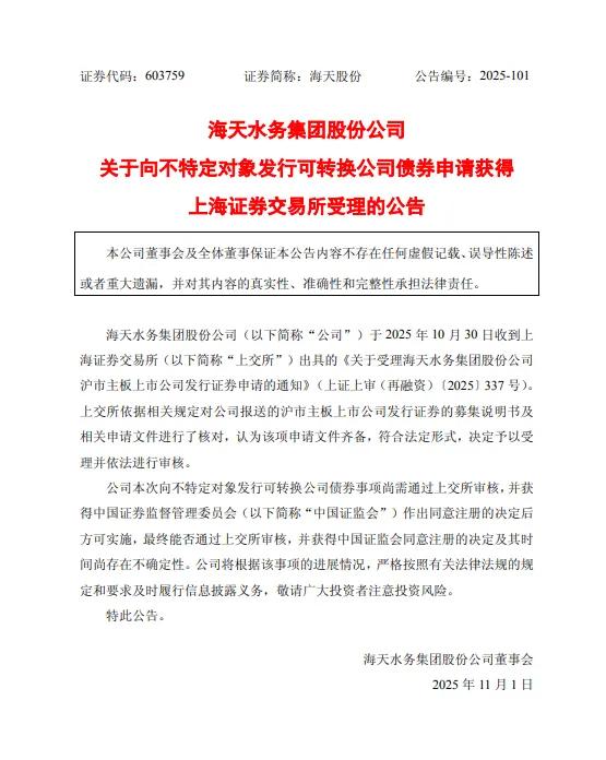 公司于2025年10月30日收到上海证券交易所(以下简称“上交所”)出具的《关于受理海天水务集团股份公司沪市主板上市公司发行证券申请的通知》(上证上审(再融资)〔2025〕337号)。上交所依据相关规定对公司报送的沪市主板上市公司发行证券的募集说明书及相关申请文件进行了核对,认为该项申请文件齐备,符合法定形式,决定予以受理并依法进行审核。