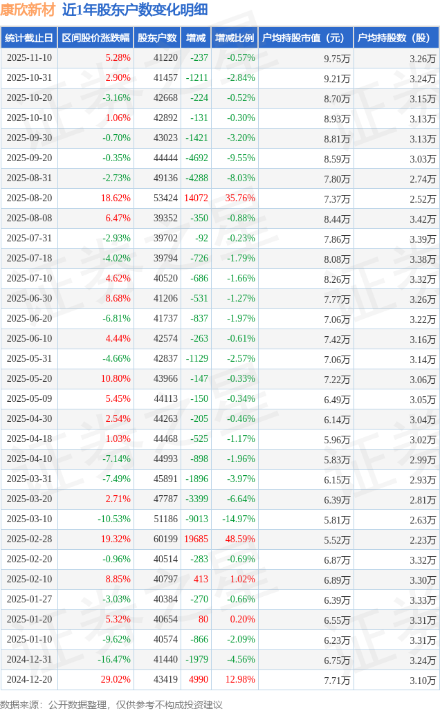 从股价来看,2025年10月31日至2025年11月10日,康欣新材区间涨幅为5.28%,在此期间股东户数减少237.0户,减幅为0.57%。