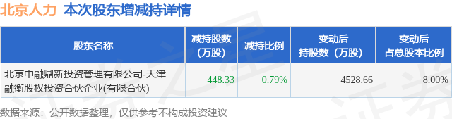 证券之星消息,11月12日北京人力发布公告《北京人力:北京人力关于持股5%以上股东权益变动触及1%刻度的提示性公告》,其股东北京中融鼎新投资管理有限公司-天津融衡股权投资合伙企业(有限合伙)于2025年10月17日至2025年11月11日间合计减持448.33万股,占公司目前总股本的0.7919%,变动期间该股股价下跌2.47%,截止11月11日收盘报18.97元。
