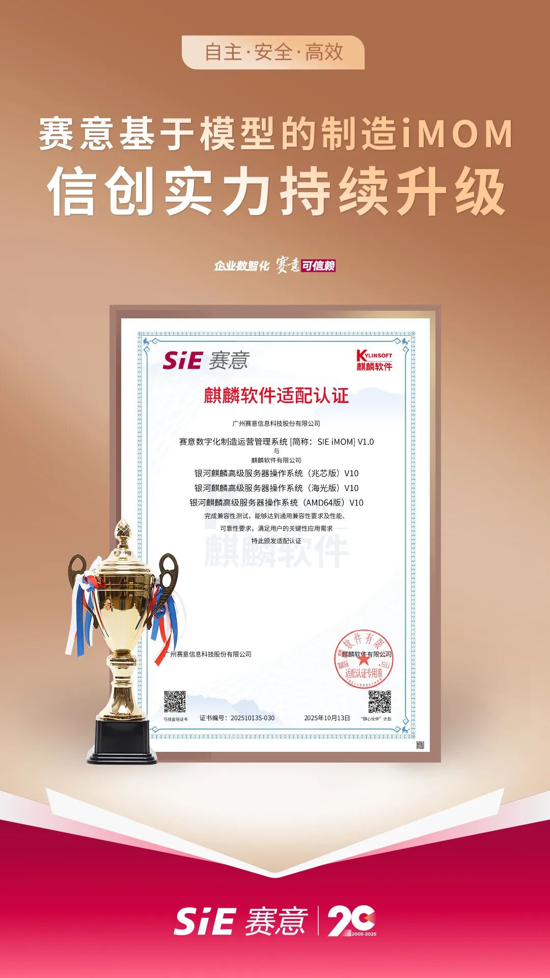 近日,赛意基于模型的制造iMOM V1.0 成功通过麒麟操作系统兼容适配认证,标志着赛意iMOM在国产操作系统安全性方面迈上新台阶,测试结果表明,赛意iMOM自主研发的生产执行、质量过程追溯、设备全生命周期管理、自动化集成、数智运营等核心解决方案,与麒麟软件旗下的银河麒麟高级服务器操作系统V10深度兼容,系统运行高效稳定,功能表现卓越,可充分满足制造企业国产替代对高性能、高安全性、高可靠性的严苛需求。