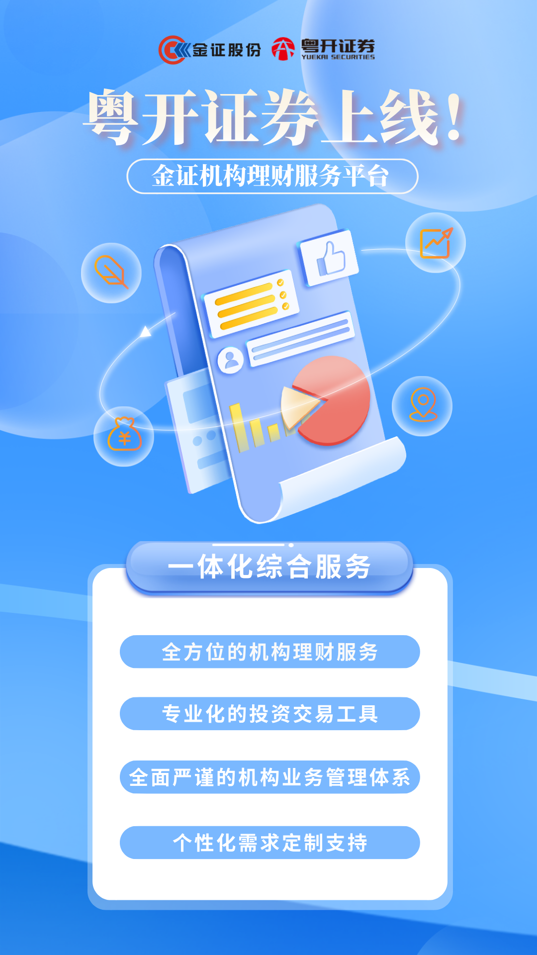 粤开证券以机构专业服务为基石,以金融科技为引擎,携手金证构建了一站式机构理财服务平台“企业宝”,为企业客户提供覆盖投前研究、投中交易、投后分析、运营风控的一体化综合服务。