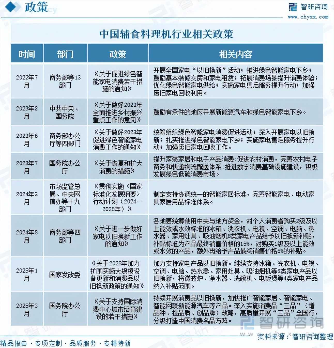 辅食料理机是一种家电产品,主要用于制作婴幼儿辅食。近年来,为推动家电行业的发展,我国陆续发布了许多政策。例如,2025年1月,国家发改委印发《关于2025年加力扩围实施大规模设备更新和消费品以旧换新政策的通知》,加力支持家电产品以旧换新。继续支持冰箱、洗衣机、电视、空调、电脑、热水器、家用灶具、吸油烟机等8类家电产品以旧换新,将微波炉、净水器、洗碗机、电饭煲等4类家电产品纳入补贴范围。2025年3月,国务院办公厅印发《关于支持国际消费中心城市培育建设的若干措施》,持续开展消费品以旧换新,加快推广智能家居、智能家电、智能网联新能源汽车等产品。深入实施消费品“三品”(增品种、提品质、创品牌)战略,高质量开展“三品”全国行,分级打造中国消费名品方阵。