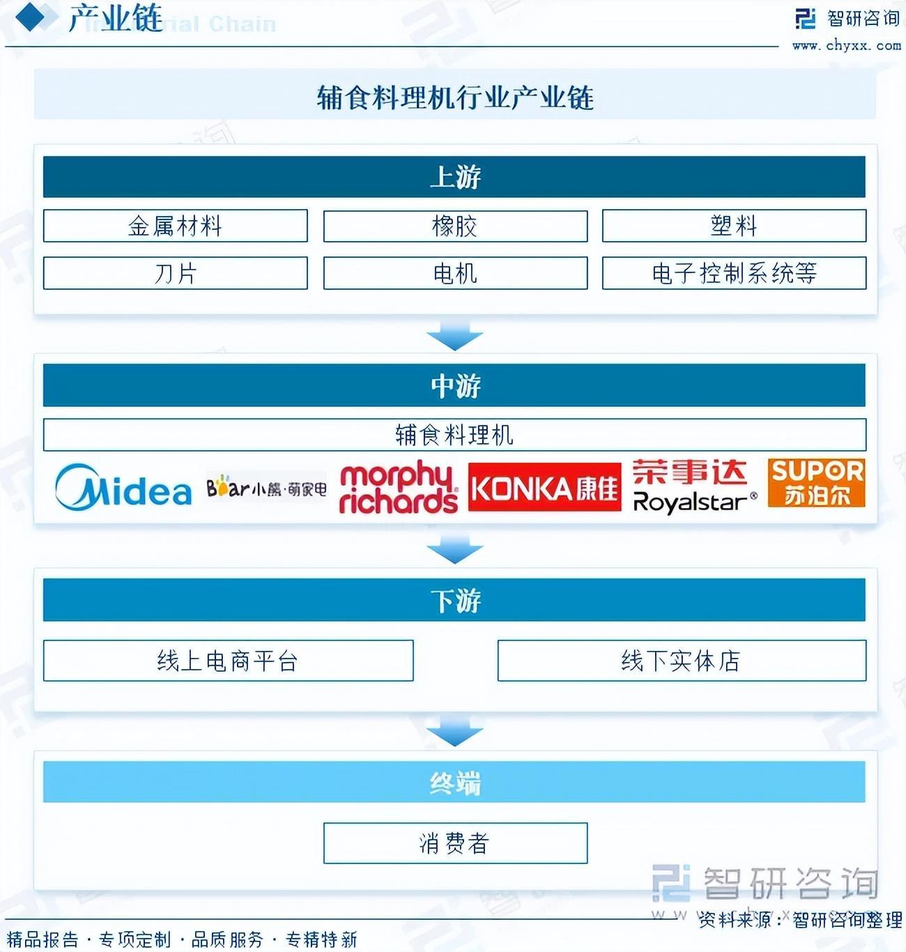 辅食料理机产业链上游为原材料和零部件,主要包括金属材料、橡胶、塑料、刀片、电机、电子控制系统等。产业链中游为辅食料理机的生产制造环节。产业链下游为销售渠道,包括线上电商平台和线下实体店,终端为消费者。