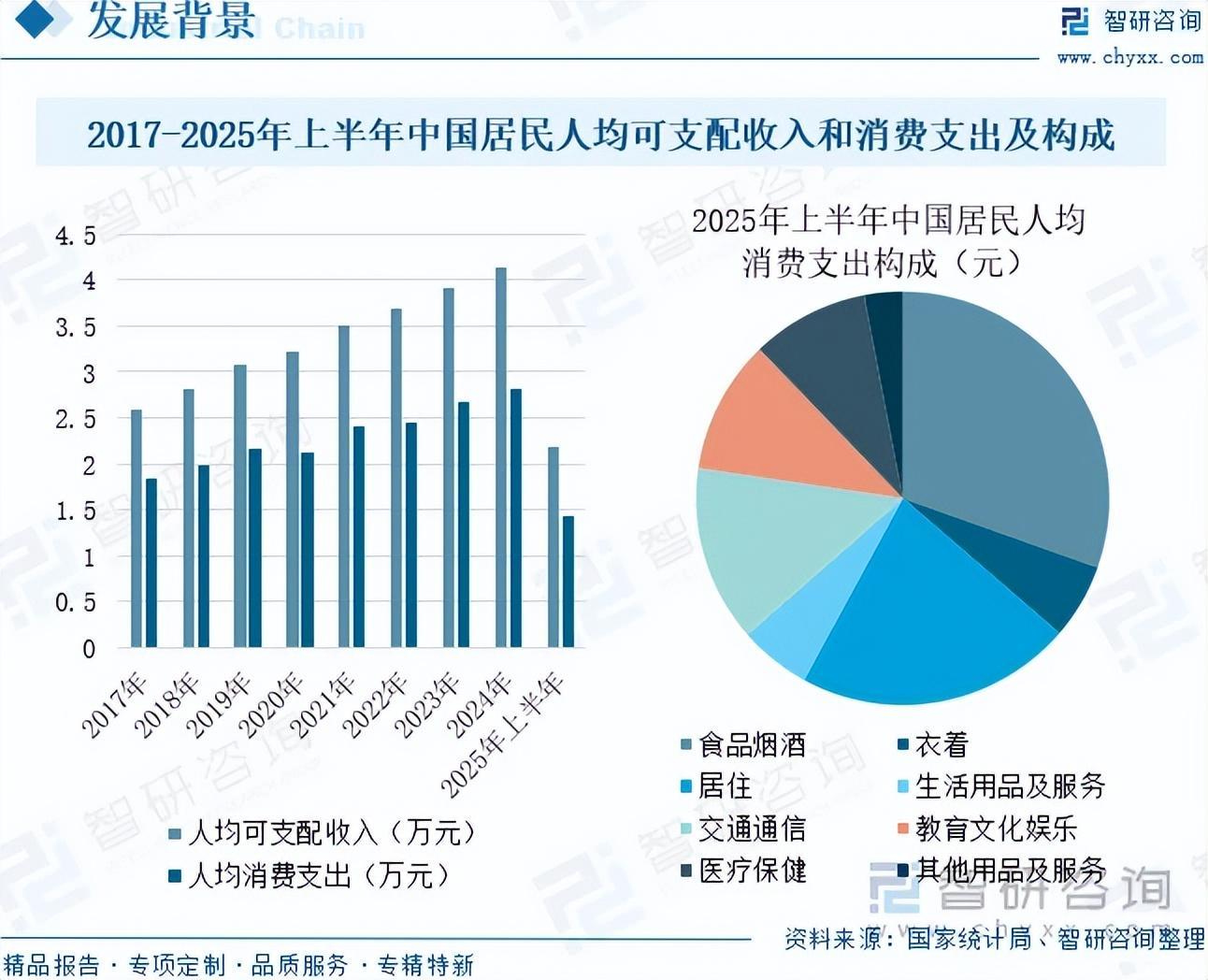 随着中国居民消费结构向品质化升级,育儿领域对专业化工具的需求显著增长。辅食料理机作为提升育儿品质的代表性产品,其发展深度契合这一趋势。在居民收入水平持续提高和消费能力增强的背景下,消费者更青睐能够优化生活品质的创新家电,这为辅食料理机行业创造了有利的发展环境。国家统计局数据显示,中国居民人均可支配收入从2017年的2.6万元增长至2024年的4.13万元,年复合增长率为6.83%;人均消费支出从2017年的1.83万元增长至2024年的2.82万元,年复合增长率为6.37%。2025年上半年,中国居民人均可支配收入为2.18万元,同比增长5.3%;人均消费支出为1.43万元,同比增长5.2%。其中,2025年上半年,人均生活用品及服务消费支出804元,增长9.0%,占人均消费支出的比重为5.6%。