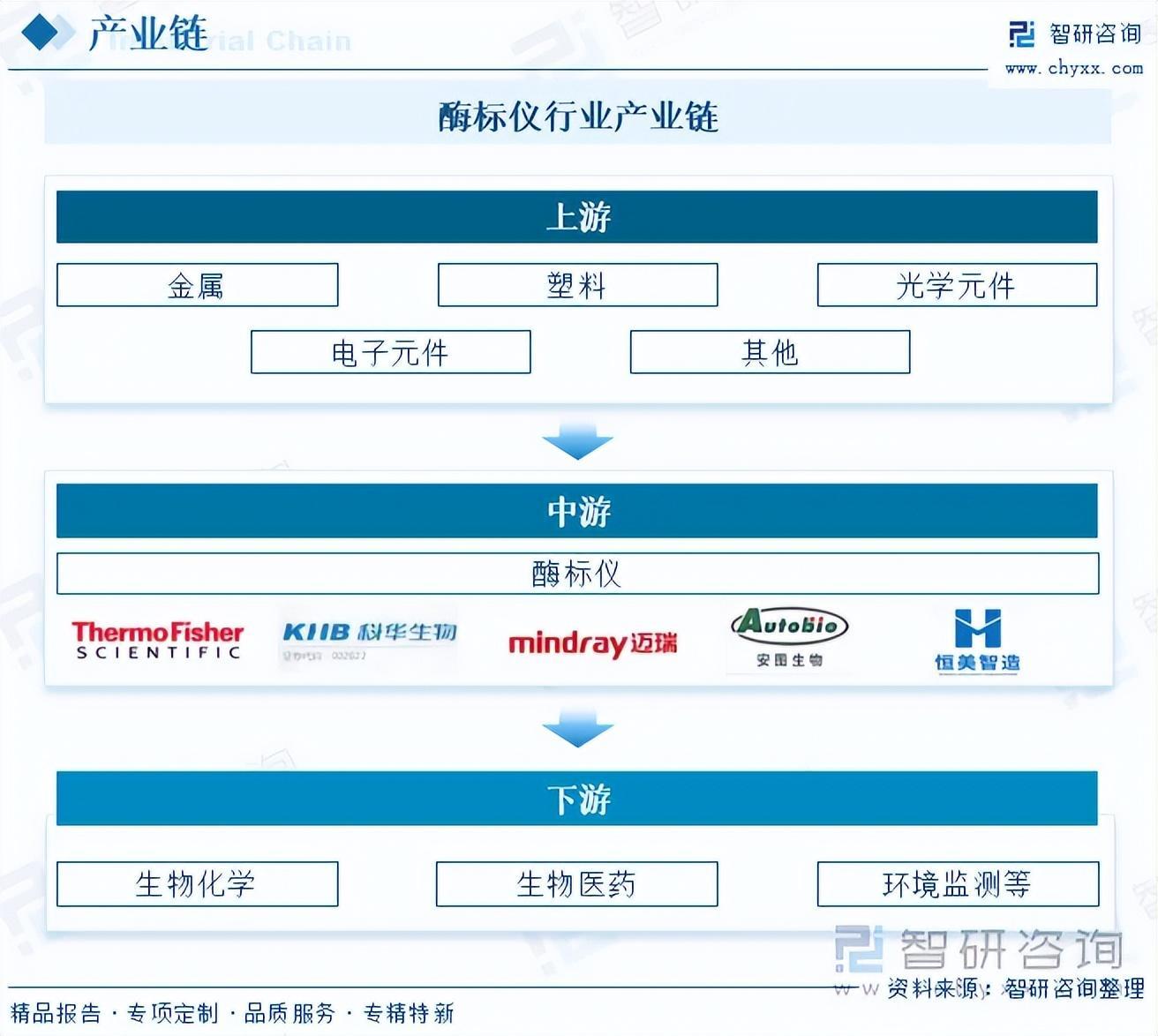 从产业链来看,酶标仪行业上游原材料主要包括用于制造机身的金属和塑料、光学元件(如滤光片、透镜等)、电子元件(如电路板、传感器、显示屏等)等。这些原材料的质量和性能直接影响到酶标仪的制造质量和性能稳定性。中游是指酶标仪的生产制造,该环节的制造商负责将上游提供的原材料、零部件和技术进行整合和创新,制造出符合市场需求和性能要求的酶标仪产品。下游是指应用领域,包括生物化学、生物医药、环境监测等。在生物化学中,酶标仪可以用于研究酶的性质、功能以及相互作用机制,为科学家们提供重要数据支持;在生物医药领域,酶标仪可用来诊断疾病、监测疾病状况和评估治疗效果,为医学研究和临床诊断提供有力的工具;在环境监测方面,酶标仪可以帮助科研人员监测环境中的污染情况,为环境保护和改善提供科学依据。
