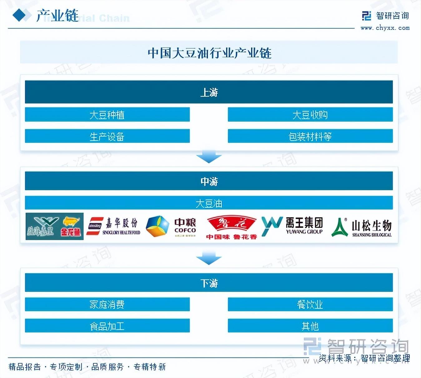 大豆油行业上游主要包括大豆种植、大豆收购、生产设备、包装材料等行业,行业中游为大豆油生产企业,行业下游为消费市场,包括家庭消费、餐饮业、食品加工等领域,其中,家庭消费市场对大豆油的价格和品牌较为敏感,不同家庭根据自身需求和消费能力选择不同品牌和规格的大豆油;餐饮领域,如各类中式餐厅、西式餐厅、快餐连锁等,对大豆油的需求量较大,且对品质有一定要求,通常会选择性价比高、品质稳定的大豆油产品;在食品加工领域,大豆油是许多食品产品的关键原料,如饼干、方便面、油炸食品、烘焙产品等,食品加工企业对大豆油的品质和供应稳定性要求较高。