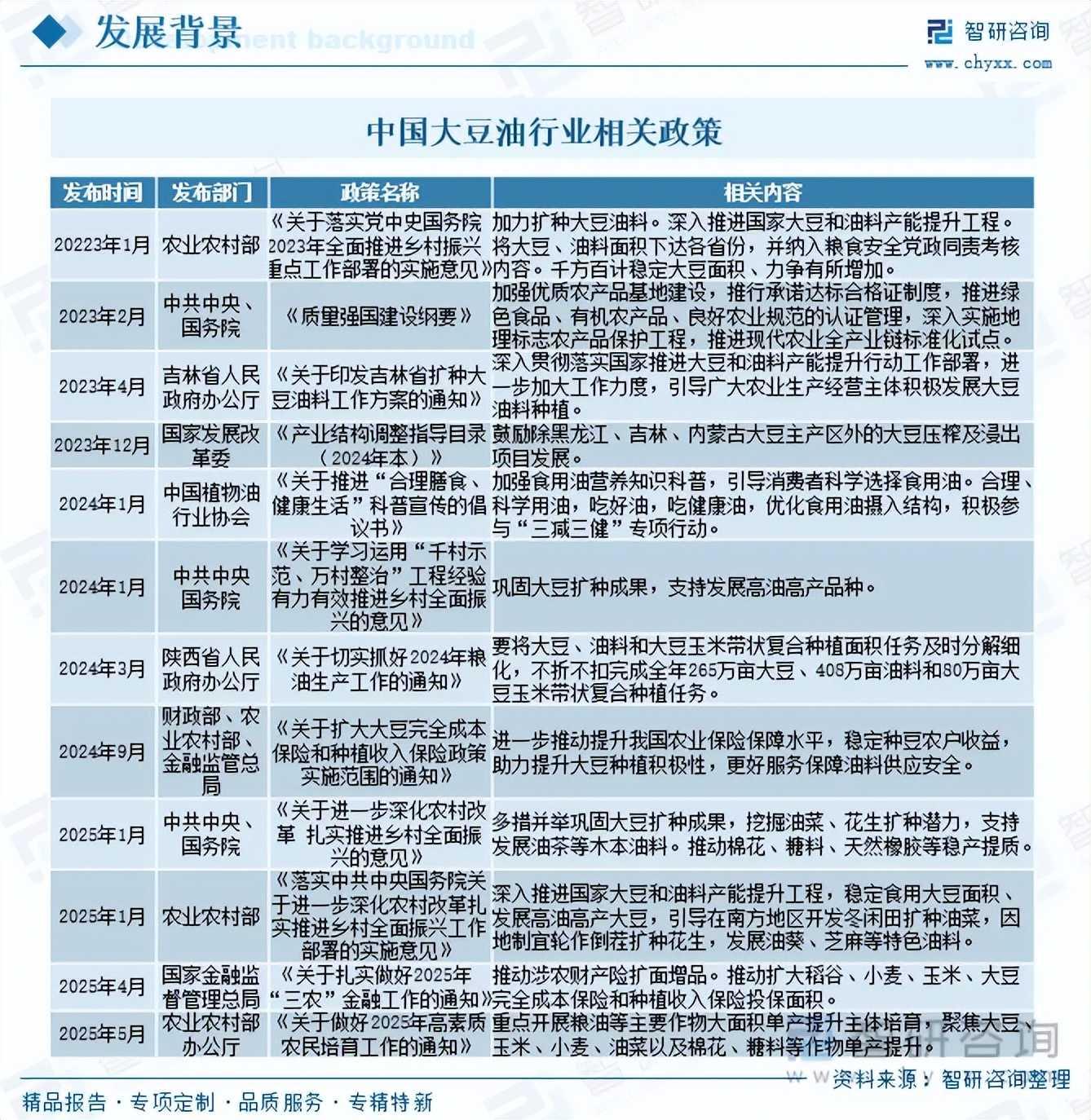 我国高度重视大豆油产业发展,相继发布《关于落实党中史国务院2023年全面推进乡村振兴重点工作部署的实施意见》《质量强国建设纲要》《关于印发吉林省扩种大豆油料工作方案的通知》《产业结构调整指导目录(2024年本)》《关于推进“合理膳食、健康生活”科普宣传的倡议书》《关于学习运用“千村示范、万村整治”工程经验有力有效推进乡村全面振兴的意见》《关于切实抓好2024年粮油生产工作的通知》《关于扩大大豆完全成本保险和种植收入保险政策实施范围的通知》《关于进一步深化农村改革 扎实推进乡村全面振兴的意见》《落实中共中央国务院关于进一步深化农村改革扎实推进乡村全面振兴工作部署的实施意见》《关于扎实做好2025年“三农”金融工作的通知》《关于做好2025年高素质农民培育工作的通知》等一系列政策提高大豆自给率,保障原材料供应,同时对大豆油的生产、质量、安全等方面都提出了严格要求,促使大豆油企业加强质量控制和管理,保障产品安全,推动我国大豆油行业往规范化、高质量方向发展。