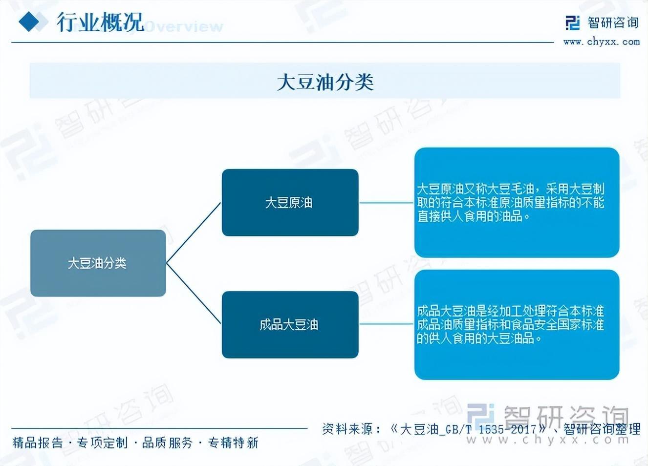 根据《大豆油_GB/T 1535-2017》,大豆油分为大豆原油和成品大豆油两大类,其中,大豆原油又称大豆毛油,采用大豆制取的符合本标准原油质量指标的不能直接供人食用的油品;成品大豆油是经加工处理符合本标准成品油质量指标和食品安全国家标准的供人食用的大豆油品。