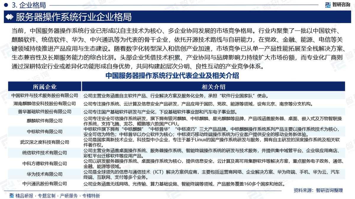 企业格局:当前,中国服务器操作系统行业已形成以自主技术为核心、多企业协同发展的市场竞争格局。行业内聚集了一批以中国软件、麒麟软件、统信软件、华为、中兴通讯等为代表的骨干企业,依托开源技术路线与自研能力,在党政、金融、能源、电信等关键领域持续推进产品应用与生态建设。随着数字化转型深入和信创产业加速,市场竞争已从单一产品性能拓展至全栈解决方案、生态兼容性及长期服务能力的综合比拼。头部企业凭借技术积累、产业协同与品牌影响力持续扩大市场份额,而专业化厂商则通过深耕特定行业或差异化功能形成自身优势,共同构建起层次分明、良性互动的产业竞争体系。