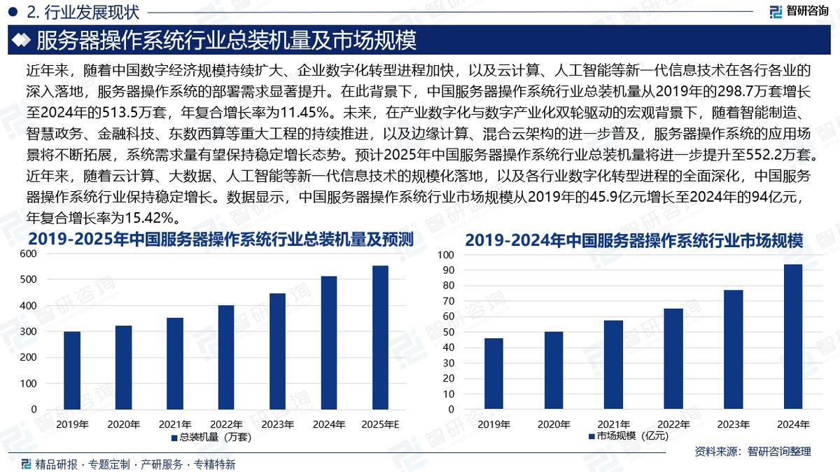 服务器操作系统一般指的是安装在大型计算机上的操作系统,比如Web服务器、应用服务器和数据库服务器等,是企业IT系统的基础架构平台,也是按应用领域划分的3类操作系统之一(另外2种分别是桌面操作系统和嵌入式操作系统)。同时,服务器操作系统也可以安装在个人电脑上。相比个人版操作系统,在一个具体的网络中,服务器操作系统要承担额外的管理、配置、稳定、安全等功能,处于每个网络中的心脏部位。服务器操作系统可以实现对计算机硬件与软件的直接控制和管理协调。任何计算机的运行离不开操作系统,服务器也一样。服务器操作系统主要分为四大流派:Windows Server、Netware、Unix、Linux。操作系统作为支撑服务器运行的基础软件环境,其性能、稳定性与安全性直接决定了数字基础设施的效能与可靠程度。当前,服务器操作系统市场以Linux与Windows Server等为主流,其中Linux凭借其开源特性、卓越的稳定性和灵活的安全机制,在各类企业级与云化场景中广泛应用。近年来,随着中国数字经济规模持续扩大、企业数字化转型进程加快,以及云计算、人工智能等新一代信息技术在各行各业的深入落地,服务器操作系统的部署需求显著提升。在此背景下,中国服务器操作系统行业总装机量从2019年的298.7万套增长至2024年的513.5万套,年复合增长率为11.45%。未来,在产业数字化与数字产业化双轮驱动的宏观背景下,随着智能制造、智慧政务、金融科技、东数西算等重大工程的持续推进,以及边缘计算、混合云架构的进一步普及,服务器操作系统的应用场景将不断拓展,系统需求量有望保持稳定增长态势。预计2025年中国服务器操作系统行业总装机量将进一步提升至552.2万套。在全球信息化浪潮的推动下,服务器操作系统作为企业IT基础设施的核心平台,承担着支撑业务运营、处理海量数据和保障网络服务的关键职责。当前全球市场主要由微软Windows Server、开源Linux及其衍生系统、传统Unix以及中国厂商推出的华为OpenEuler、阿里巴巴Anolis OS、麒麟软件银河麒麟等操作系统共同构成。中国企业在服务器操作系统领域的持续投入正逐步改变全球竞争格局:OpenEuler以开源协作构建生态,Anolis OS深耕云原生技术体系,银河麒麟则聚焦安全可控方向,共同推动中国在服务器操作系统领域实现具有战略意义的突破。这一发展不仅提升了我国在信息技术领域的国际影响力,也为构建自主可控、安全可靠的数字基础设施提供了重要支撑。近年来,随着云计算、大数据、人工智能等新一代信息技术的规模化落地,以及各行业数字化转型进程的全面深化,中国服务器操作系统行业保持稳定增长。数据显示,中国服务器操作系统行业市场规模从2019年的45.9亿元增长至2024年的94亿元,年复合增长率为15.42%。当前,中国服务器操作系统行业已形成以自主技术为核心、多企业协同发展的市场竞争格局。行业内聚集了一批以中国软件、麒麟软件、统信软件、华为、中兴通讯等为代表的骨干企业,依托开源技术路线与自研能力,在党政、金融、能源、电信等关键领域持续推进产品应用与生态建设。随着数字化转型深入和信创产业加速,市场竞争已从单一产品性能拓展至全栈解决方案、生态兼容性及长期服务能力的综合比拼。头部企业凭借技术积累、产业协同与品牌影响力持续扩大市场份额,而专业化厂商则通过深耕特定行业或差异化功能形成自身优势,共同构建起层次分明、良性互动的产业竞争体系。