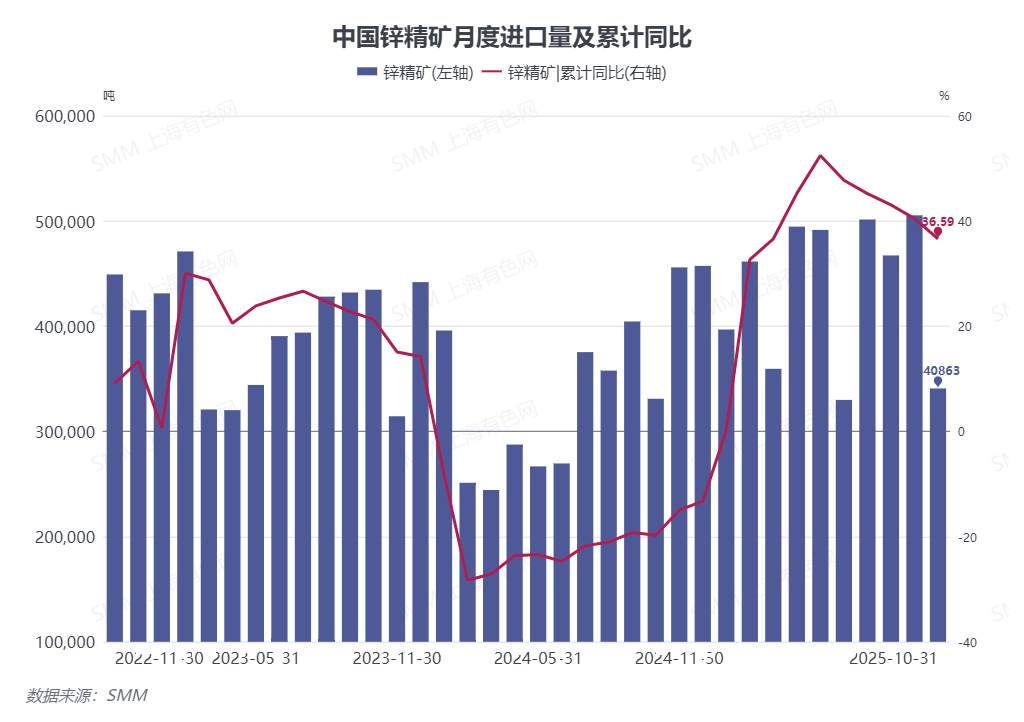 根据最新海关数据显示,2025年10月进口锌精矿34.09万吨(实物吨),10月环比9月降低32.56%(16.45万实物吨),同比增加2.97%。1-10月累计锌精矿进口量为434.89万吨(实物吨),累计同比增加36.59%。