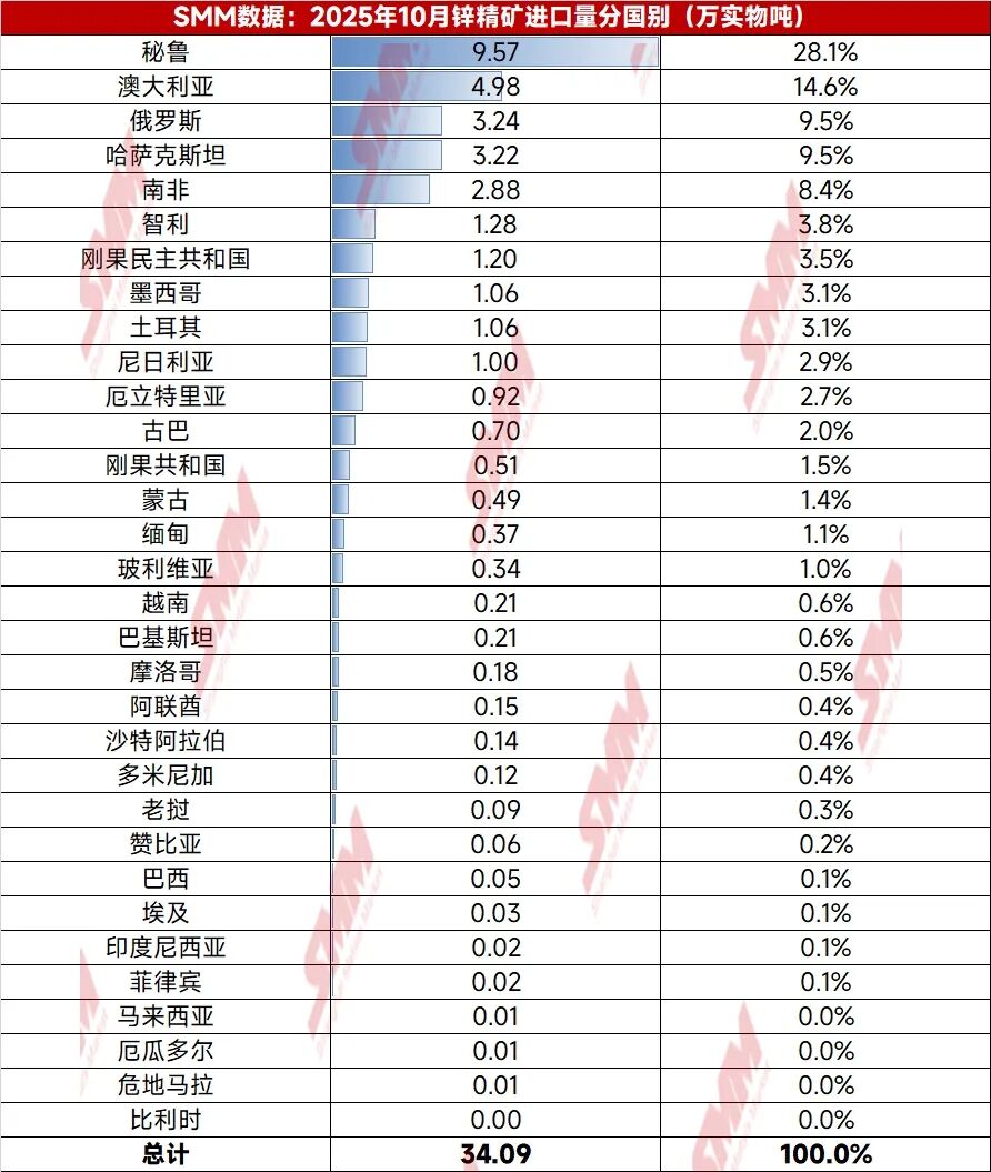 受周期性到货影响,澳大利亚锌精矿10月到货量出现显著减少,贡献主要减量;
