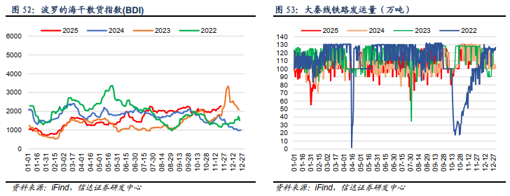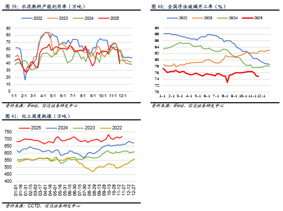 化工耗煤周环比增加,钢铁高炉开工率周环比下降。化工周度耗煤:截至11月21日,化工周度耗煤较上周上升8.76万吨/日,周环比增加1.24%。高炉开工率:截至11月21日,全国高炉开工率82.2%,周环比下降0.62百分点。水泥开工率:截至11月21日,水泥熟料产能利用率为39.3%,周环比下跌19.9百分点。