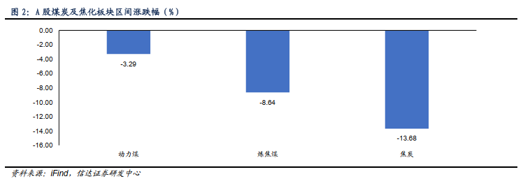⚫ 本周动力煤板块下跌3.29%,炼焦煤板块下跌8.64%,焦炭板块下跌13.68%。