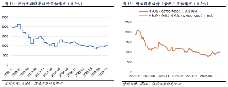 ⚫ 截至11月14日,长治潞城喷吹煤(Q6700-7000)车板价(含税)价格1017.0元/吨,周环比上涨5.0元/吨;阳泉喷吹煤车板价(含税)(Q7000-7200)1007.7元/吨,周环比上涨5.1元/吨。