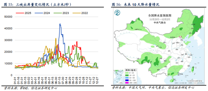 ⚫ 截至11月21日,三峡出库流量为11800立方米/秒,周环比增加12.38%。